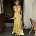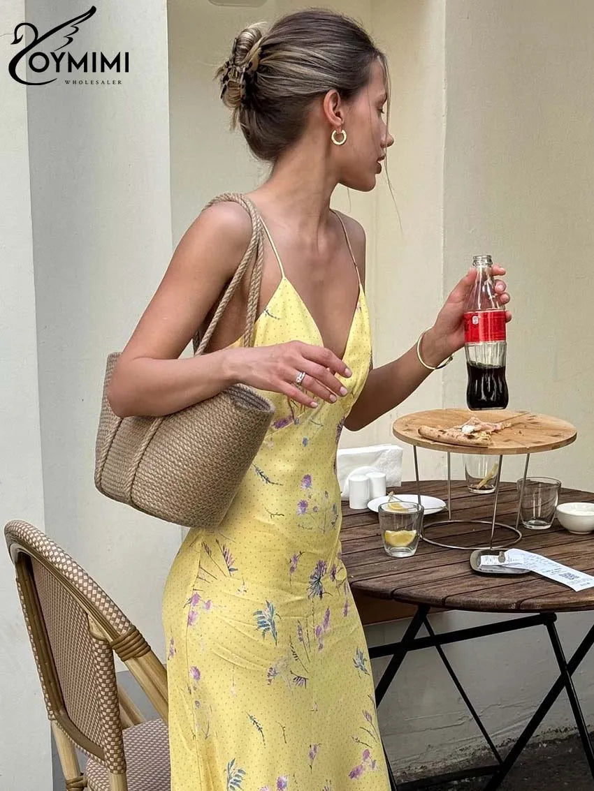 Oymimi Casual Yellow Print Women's Dress Elegant Spaghetti Strap Open Back Dresses Autumn Fashion High Waist Ankle-Length Dress